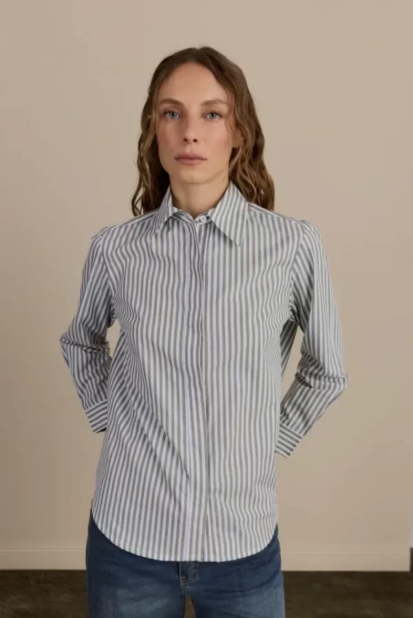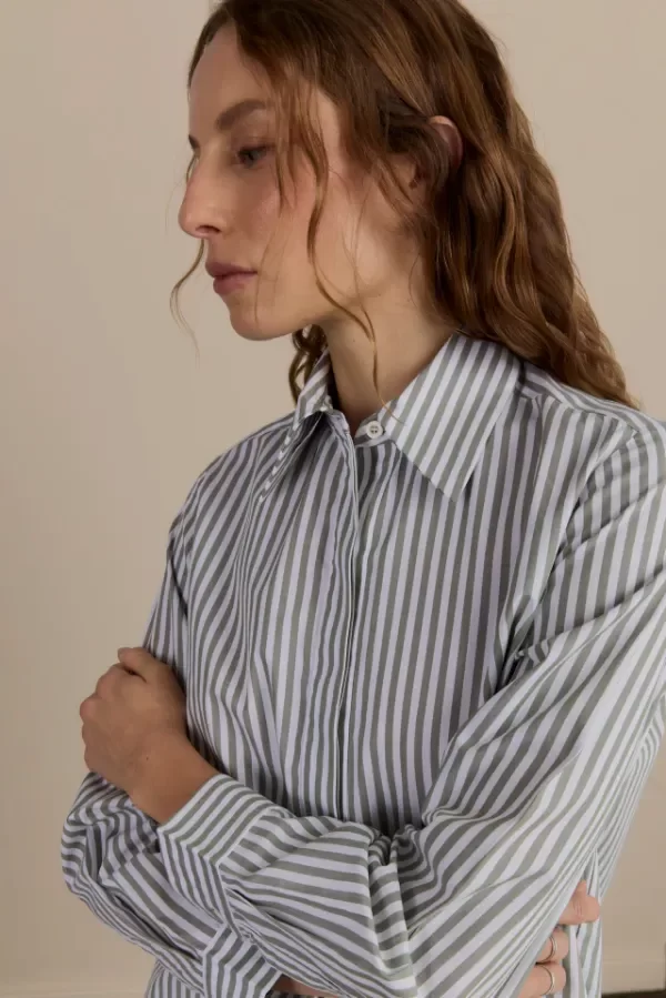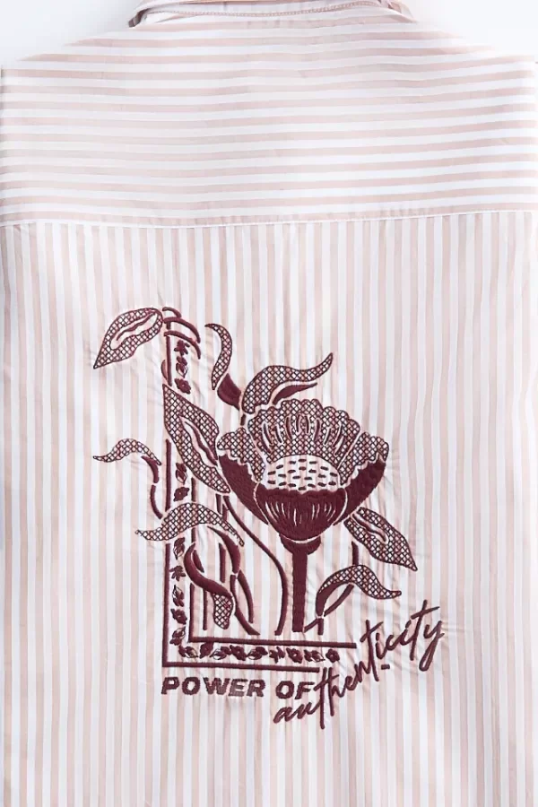Camisa confeccionada en poplin rayado. Silueta recta con puños y cuello camisero. Presenta maxi bordado exclusivo en centro de espalda.