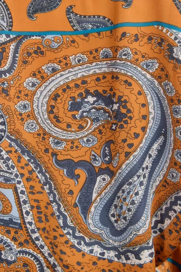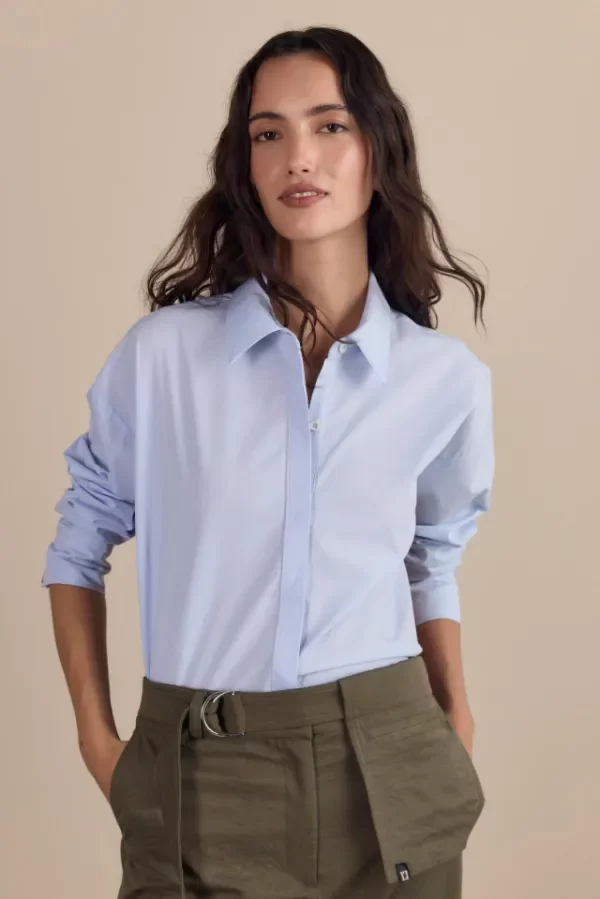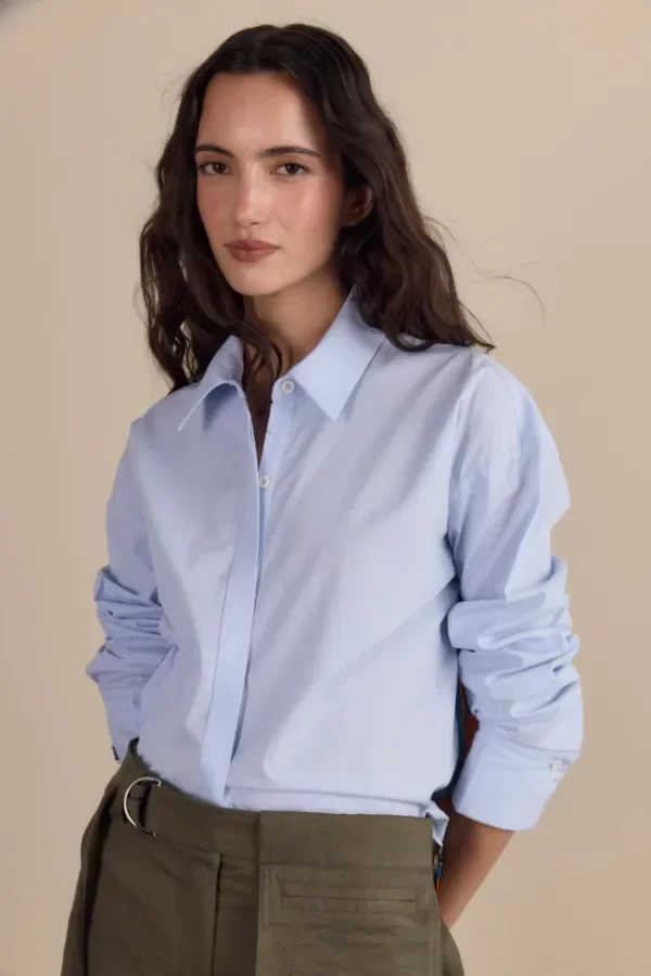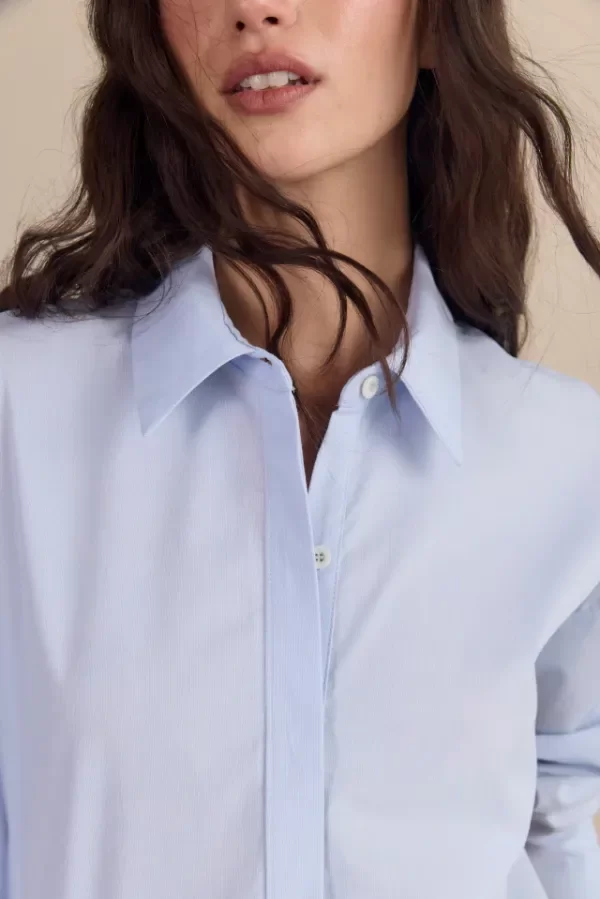 Camisa de poplin de algodón microrayada celeste y blanco, denominada "falso liso" ya que las rayas son casi imperceptibles. Su silueta clásica de corte amplio, se destaca por su espalda en sedita hecha con pañuelos. Esta combinación hace a una prenda clásica totalmente distintiva.