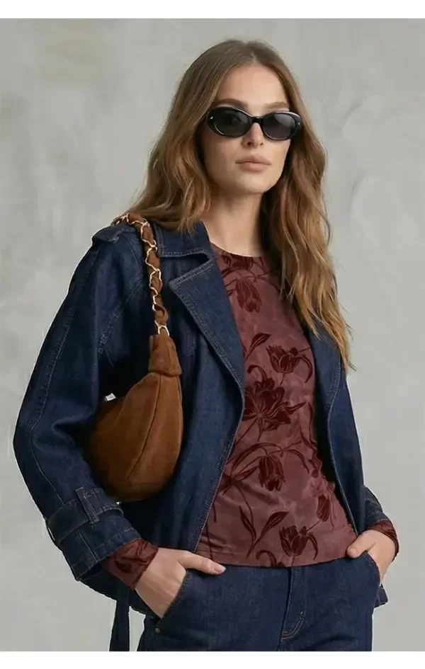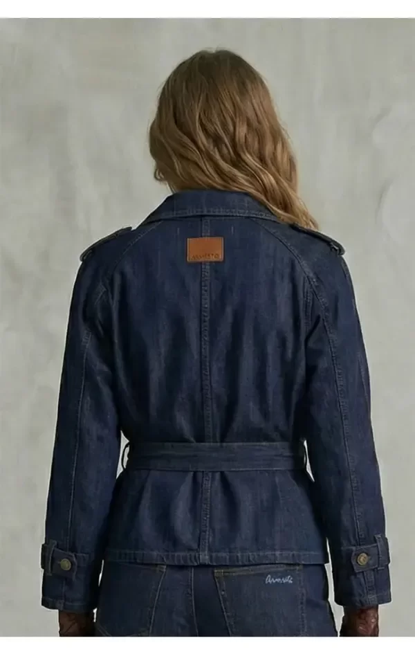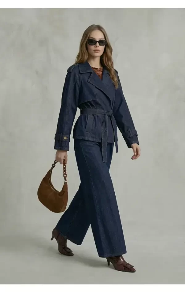 Chaqueta de jean en azul fuerte con pespuntes cocidos en tono marron. Lazo para ajustar a gusto con bolsillos delanteros. Corte de cuello tipo camisa. Final de manga tipo jean con presilla y cinto para ajustar. Largo por debajo de cintura, modelo muy canchero que se puede combiar con cualquier prenda.