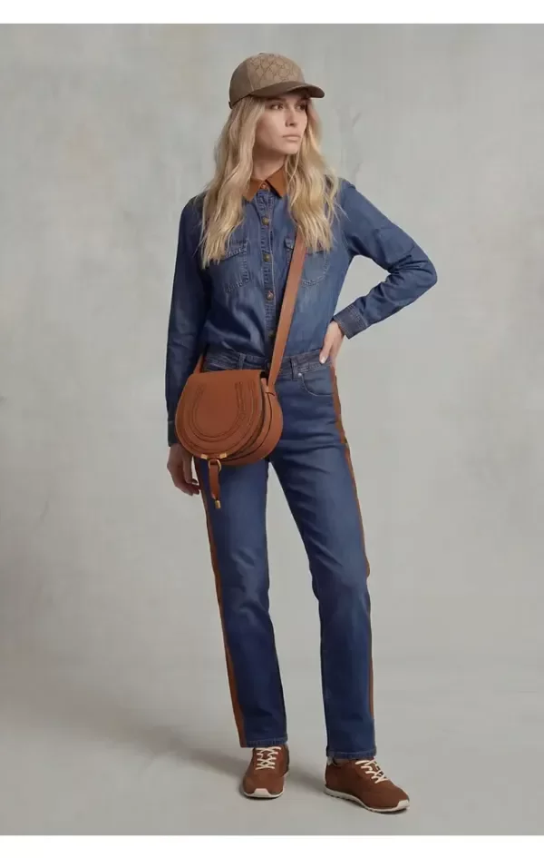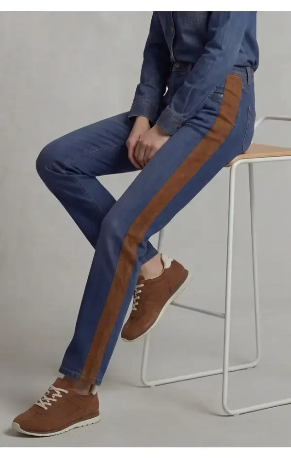 Jean de pierna recta con lateral en gamuza en tono marron. Bolsillos delanteros y traseros. Ideal para hacer conjunto con la camisa