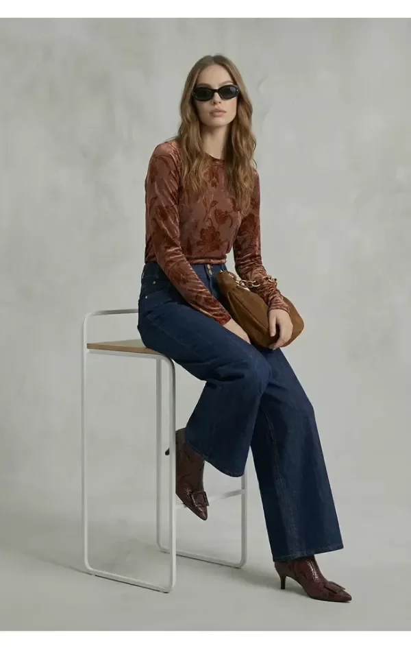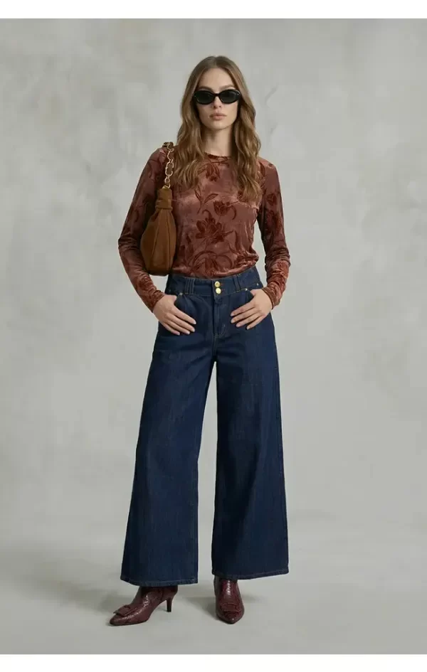 Wide en tono azul fuerte con bolsillos delanteros en diagonal y traseros. Cintura ancha con doble boton en tono dorado con presillas. Pierna ancha y suelta con pespuntes cocidos en tono marron. Modelo rigido