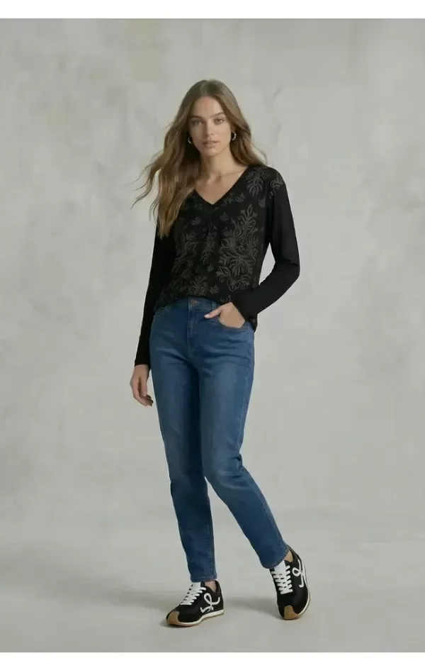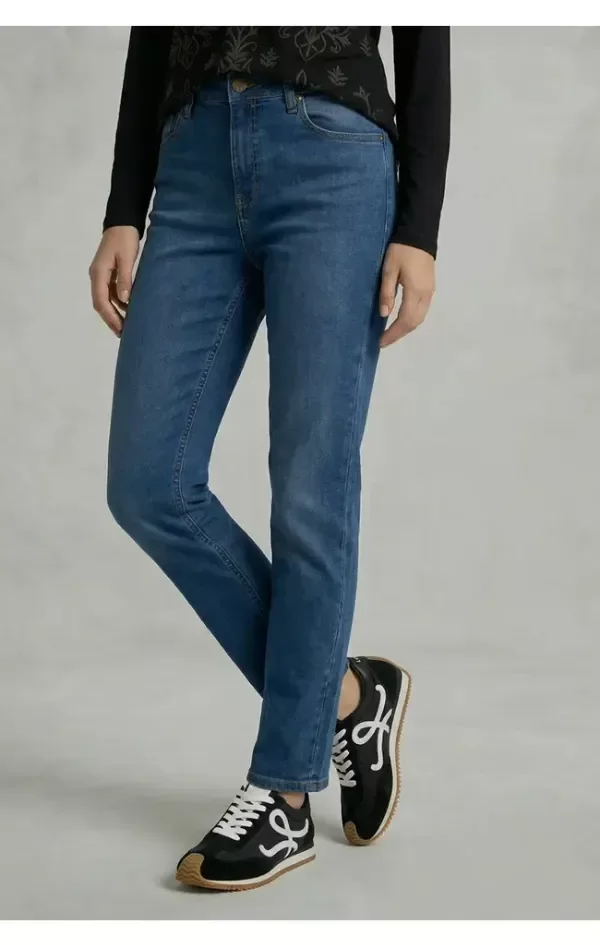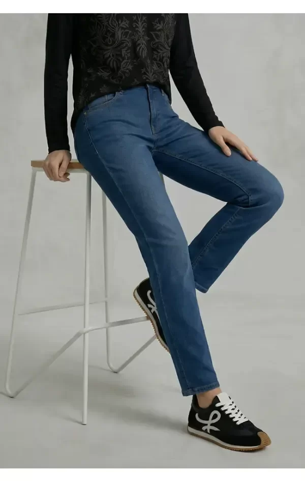 Jean clasico de color liso con spandex, tiro medio alto. Pierna recta con 5 bolsillos. Detalle de bordado Armesto a tono en bolsillo trasero derecho