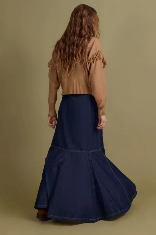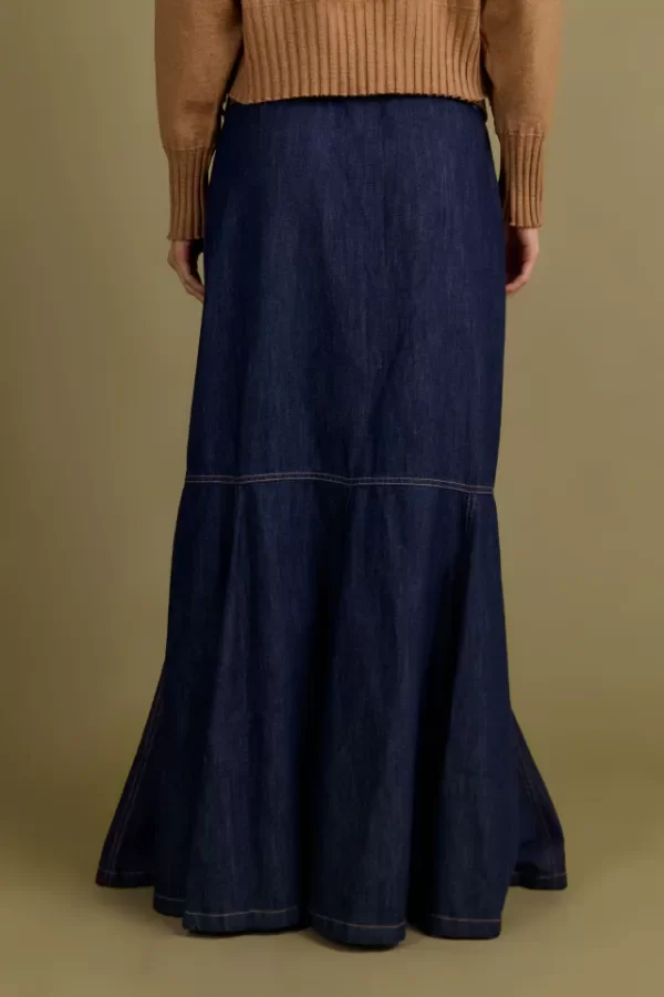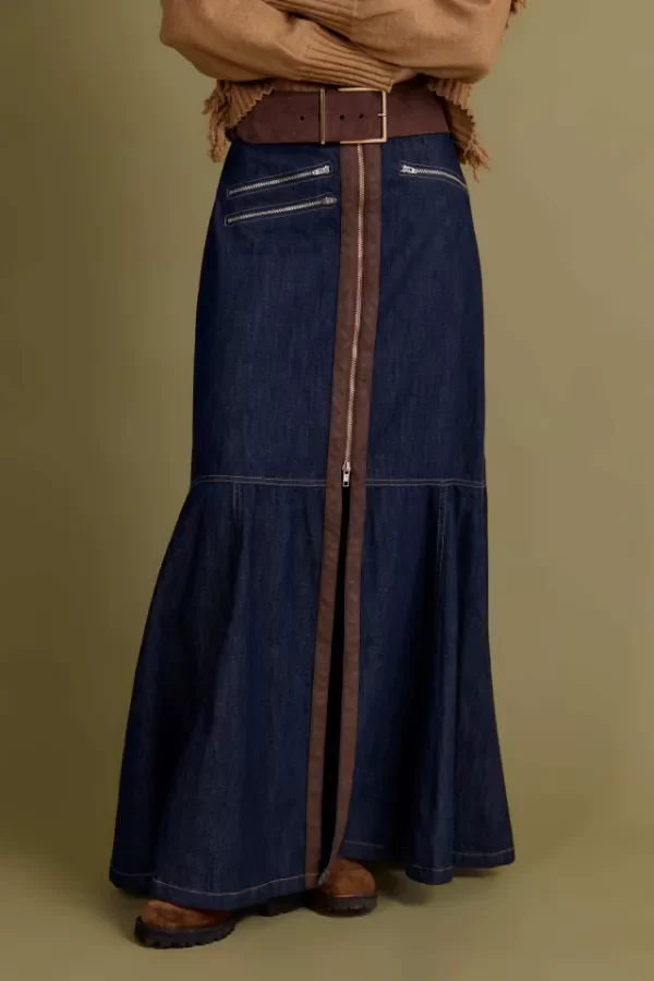 Pollera confeccionada en denim de algodón combinada con detalles en PU. En centro de acceso posee cierre metálico que recorre desde la mitad de la falda permitiendo generar un tajo central súper canchero. Cierres metálicos en diagonal sobre delantero superior de la prenda.
