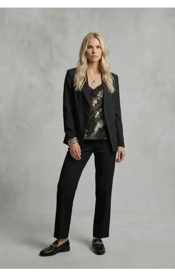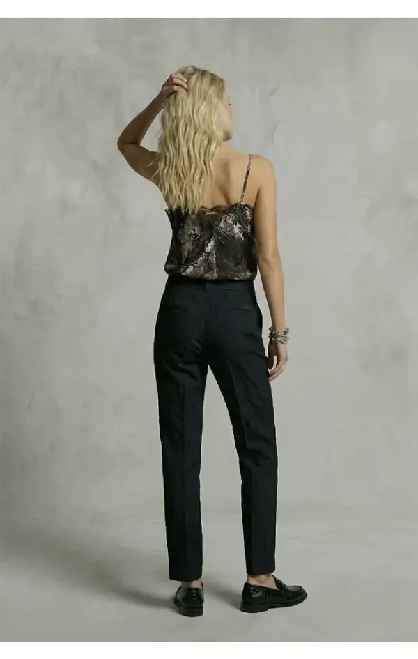 Musculosa con motivo reptil de bretel finito regulable. Puntilla en escote, larga por debajo de cintura de pantalon